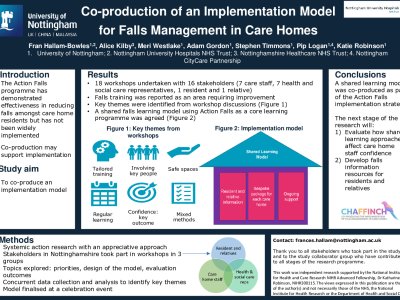Introduction The Action Falls programme has demonstrated effectiveness in reducing falls amongst care home residents in a trial but has not been implemented widely (Logan et al, BMJ, 2021, 375, e066991). Co-production of implementation has been identified as a mechanism for achieving buy-in. This study aimed to co-produce an implementation model. Methods Systemic action research with an appreciative approach framed co-production workshops in three stakeholder groups: residents and relatives, care home staff and representatives from health and social care organisations. Topics explored were