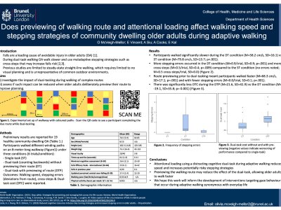 Abstract Content - Introduction. When required to multitask while walking, older adults (OA) will walk slower and use maladaptive stepping strategies such as cross-steps that may increase the risk of falling. However, most studies to date have been limited to steady-state straight-line walking, which requires limited to no visual planning, which is unrepresentative of common outdoor environments. Therefore, this study aimed to (i) investigate the impact of dual-tasking during walking of complex routes, and (ii) assess if such impact can be reduced when older adults deliberately preview their