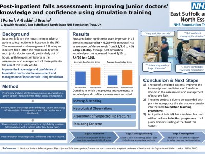 Introduction: Inpatient falls are the most common adverse patient safety incidents in hospitals in the UK. The assessment and management following an inpatient fall is often the responsibility of the most junior doctor on call, particularly out of hours. Frequently, there are key omissions in the assessment of these patients, leading to missed diagnoses, poor management and avoidable patient harm. This study aimed to improve the knowledge and confidence of foundation doctors in the assessment and management of inpatient falls. Method: 31 patients were identified who had suffered ‘severe harm’
