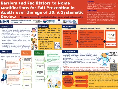 Abstract Content - Introduction Falls are the leading cause of preventable death in older adults and can also lead to psychological consequences, including concerns about future falls. Although literature traditionally focuses on those over 65 yrs, recent research shows adults as young as 50 yrs could be at risk. Most falls occur at home and are often due to environmental hazards. Despite evidence supporting a 38% reduction in falls through home modifications, their efficacy in not fully understood. Exploring barriers and facilitators to home modifications aimed at reducing falls and concerns