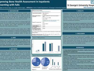 Introduction Fragility fractures are associated with significant morbidity and mortality. The National Osteoporosis Guideline Group advise that a FRAX assessment should be completed in all patients with falls. Despite this only 3% of patients admitted to a geriatric ward following a fall had a bone health assessment completed within 72 hours of admission. Our aim is for a bone health assessment to be completed in >90% of these patients. Method Our intervention focused on promoting bone health assessment with a ‘FRAX proforma’. This was aimed at junior doctors as the main cohort expected to