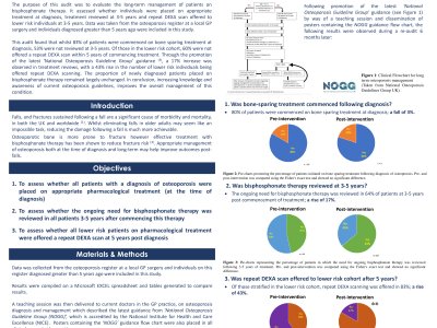 Untreated osteoporosis increases the risk of fragility fractures; a major cause of morbidity and mortality worldwide. Bisphosphonates have been shown to reduce fracture risk yet can be associated with adverse side-effects . As such, their long-term use should be monitored so that maximal benefit is obtained with minimal harm to the patient. Despite this, the management of osteoporosis in primary care remains poor. The purpose of this audit was to evaluate the long-term management of patients on bisphosphonate therapy. It assessed whether individuals were placed on appropriate treatment at