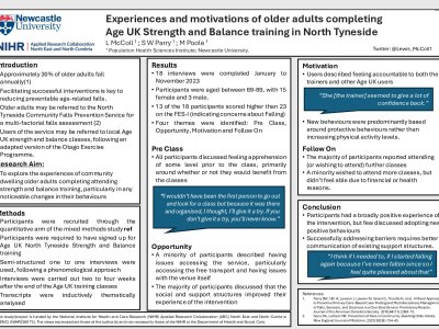 Introduction: Approximately a third of community dwelling adults over the age of 65 fall each year, with around half experiencing more than one fall per year. Currently within North Tyneside older adults who have had a fall, or are at risk of falling, may be invited to attend a specialist falls clinic; if appropriate they may be referred to Age UK North Tyneside’s Strength and Balance Class. Improving strength and balance in those at risk is an established intervention, yet adherence to programmes, and the subsequent adoption of exercise post-intervention varies. This work aims to explore why