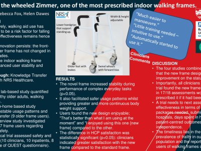 BACKGROUND Counter-intuitively, a systematic review identified general walking aid use to be a risk factor for falling; some research even linked falls directly to use of walking aids. Hence walking aids’ effectiveness remains suboptimal. Yet a lack of innovation, especially with regard to indoor walking frames, persists: the front-wheeled Zimmer frame has not changed in design for decades. It was the aim of this work to completely re-think and innovate indoor walking frame design for enhanced user stability and mobility. New features include: 1) swivel wheels at the front to help turning, but