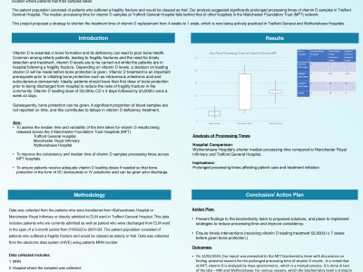 Vitamin D deficiency is common amongst elderly patients resulting in fragility fractures. Following fragility fractures, patients require vitamin D to be checked prior to initiating bone protection, e.g zoledronic acid/ denosumab. Ideally, all patients should have their first dose of bone protection prior to being discharged from hospital to reduce the risks of fragility fracture. In this project, carried out in Trafford General Hospital (TGH) amongst patients from orthogeriatric wards, we had observed that the time taken for these results varied significantly depending on the hospital
