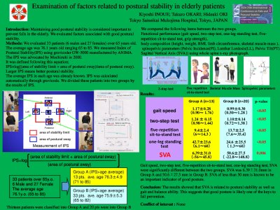 Introduction: Maintaining good postural stability is considered important to prevent falls in the elderly. We evaluated factors associated with good postural stability. Methods: We evaluated 33 patients (6 males and 27 females) over 65 years old. The average age was 76.1 years old ranging 65 to 85. We measured Index of Postural Stability(IPS) using gravicoder GW-5000 manufactured by ANIMA. The IPS was advocated by Mochizuki in 2000. It was defined following this equation; IPS=log[(area of stability limit + area of postural sway)/area of postural sway). Larger IPS means better postural