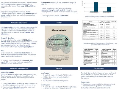 Introduction: Delirium is a common and reversible neurobehavioral condition with significant morbidity and mortality ramifications. Consequentially, clear guidelines exist pertaining to its swift identification and management. However, studies suggest adherence to these guidelines is poor. This audit evaluates compliance to the National Institute for Health and Care Excellence’s (NICE) delirium guidelines in an Acute Senior Health Unit (ASHU) and presents a single centre experience of low-cost ward-based interventions for improving guideline adherence. Methods: A retrospective observational