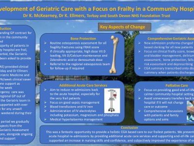 In 2022 we had a unique opportunity to develop a Geriatric service in Totnes Community Hospital after a long-standing GP led service provision ended. Given the fact that the majority of patients in the Community Hospitals were over the age of 65 and many had multiple co-morbidities or presented with a frailty syndrome, it was felt that the Geriatric department was the most suitable specialty to take over the service provision. Method Over a period of 12 months, we have gradually introduced key aspects from the Comprehensive Geriatric Assessment (CGA) to the care of our patients. Every new