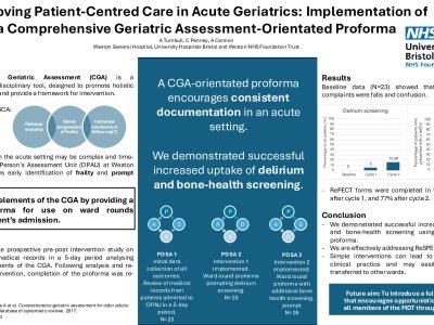 Background The Comprehensive Geriatric Assessment (CGA) is a multidimensional interdisciplinary tool, designed to promote holistic care of elderly patients and provide a framework for intervention. There is evidence that the CGA reduces mortality and slows progression of frailty. Performing such interventions in the acute setting can be complex and time-consuming. Introduction The Older Person’s Assessment Unit (OPAU) at Weston General Hospital allows early identification of frailty and prompt intervention. We aimed to promote elements of the CGA by providing a tool for utilisation throughout
