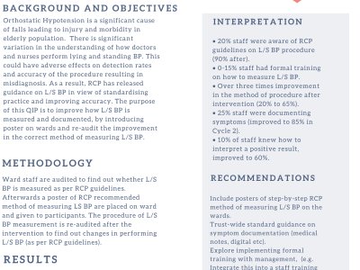 Introduction: Orthostatic Hypotension is a significant cause of falls leading to injury and morbidity in elderly population. In an online survey by Royal College of Physicians (RCP) 271 out of 316 clinicians routinely performed these measurements and there were significant variations in how lying and standing BP is performed. This could have adverse effects on detection rates and accuracy of the procedure resulting in misdiagnosis. As a result, RCP has released guidance on L/S BP2 measurements in view of standardising practice and improving accuracy. The purpose of this QIP is to improve how L