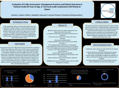 Introduction: Frailty significantly affects outcomes like length of stay and readmissions in elderly patients. At Queen Alexandra Hospital, inpatients under 85 are under the care of General Internal Medicine (GIM) wards and they lack regular access to frailty services. This baseline audit evaluated frailty assessment, management practices and patient outcomes, implementing staff education, ward posters, and a frailty Multidisciplinary Team (MDT) between cycles. Methods: Data were retrospectively collected from three GIM wards over two cycles—January and August 2024. Eligibility criteria