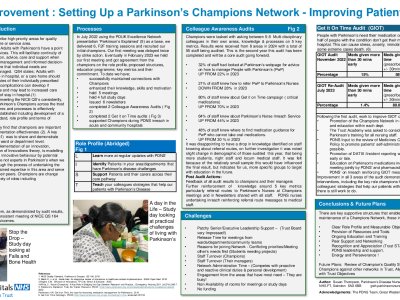 Background: NICE Quality Standard (QS) 164 – QS1 states; Adults with Parkinson's have a point of contact with specialist services. This will facilitate continuity of care and access to information, advice, care and support when they need it. QS4 states; Adults with Parkinson's disease in hospital or a care home should take levodopa within 30 minutes of their individually prescribed administration time. Introduction: To increase opportunities in meeting NICE QS’s consistently, Parkinson’s Specialist Nurses introduced Parkinson’s Champions. Individual studies consistently find that champions are