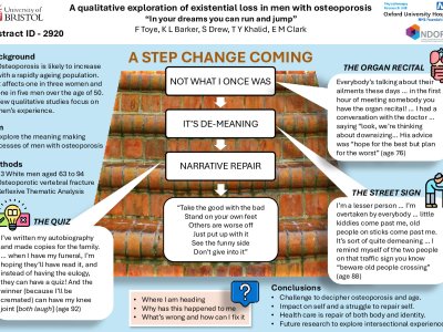 Background Osteoporosis is a global health concern that is likely to increase with a rapidly ageing world population. It affects one in three women and one in five men over the age of 50. Although there is a large body of qualitative research exploring the experience of living with osteoporosis, far fewer studies have focused on men. We aim to explore the meaning making processes of men with osteoporosis. Methods We interviewed 13 White British men aged 63 to 94 with an osteoporotic vertebral fracture We used the six stages of reflexive thematic analysis: familiarisation with the data; coding