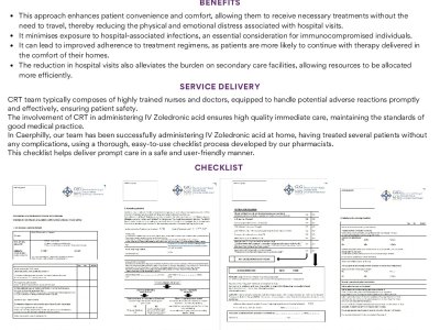 Introduction Zoledronic acid, a bisphosphonate used primarily for treating osteoporosis and other bone-related conditions, traditionally requires hospital visits for administration, which can be burdensome, especially for frail older patients. The administration of intravenous (IV) Zoledronic acid at home via Community Rapid Response Teams (CRT) represents an innovative approach to enhance patient care and accessibility while offering significant benefits to patients and healthcare services. Service Delivery CRT team is typically composed of highly trained nurses and doctors, equipped to