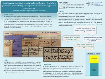 Introduction The importance of nutritional support has been extensively investigated in studies of people with hip and fragility fractures. Hospital nutritional assessments vary in quality, and this limits the extent to which risk assessment can be viewed as a meaningful indicator of nutritional support. Provision of supplements is an alternative measure, but only if known to have been consumed. For this reason, we developed a protocol to capture actual consumption of prescribed supplements. Methods Following nutritional risk assessment, the prescription and distribution of supplements was
