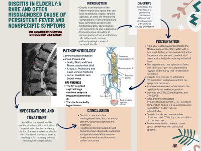 Background Discitis is an infection of the intervertebral disc space that can lead to paralysis, sepsis, epidural abscess, or other life-threatening complications if left untreated and may sometimes present with limited laboratory abnormalities and symptoms to clue a diagnosis. Hematogenous spreading of microorganisms from an infectious site is the most common pathophysiologic cause of vertebral discitis. Case Presentation A 68-year-old female presented to the Medical Assessment Unit (MAU) with a two-week history of increased micturition frequency, dysuria, and constant, dull lower abdominal