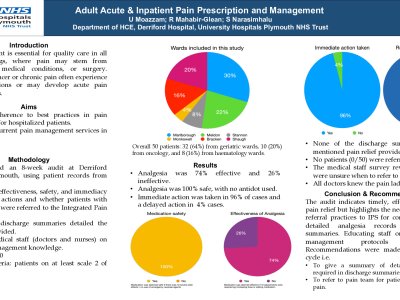Pain management is essential for quality care in all inpatient settings, where pain may stem from trauma, acute medical conditions, or surgery. Patients with cancer or chronic pain often experience acute exacerbations or may develop acute pain related problems. This audit aimed to assess adherence to best practices in pain management for hospitalized patients and compare current pain management services in UK. We conducted an 8-week audit at Derriford Hospital, Plymouth, using patient records from seeEHR. We assessed the effectiveness, safety, and immediacy of pain relief actions and whether