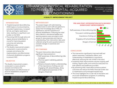 Introduction Hospital-acquired deconditioning (HAD) leads to functional decline, extended hospital stays, increased fall risk, and higher readmission rates, resulting in a significant cost burden on the NHS. Preventing HAD through early and regular physical rehabilitation is crucial for improving patient outcomes and reducing healthcare costs. This Quality improvement project , conducted in a ward, aimed to evaluate and enhance the implementation and effectiveness of physical rehabilitation programs to prevent HAD. Method The project began with administering questionnaires to both staff and