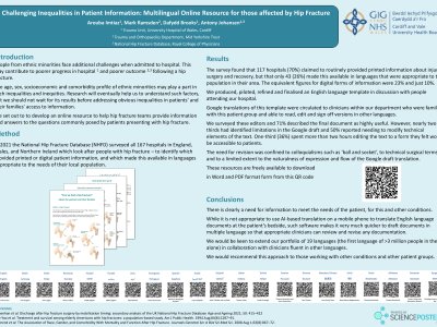 People from ethnic minorities face additional challenges in hospital. These contribute to poorer progress and outcomes. We set out to develop an online resource to help hip fracture teams provide answers to questions commonly posed by people presenting with hip fracture, and to address inequalities in patients’ and their families’ access to information. Method In 2021 we surveyed all 167 hospitals in England, Wales, and Northern Ireland which look after people with hip fracture – to identify which provided printed or digital information, and which made this available in languages appropriate