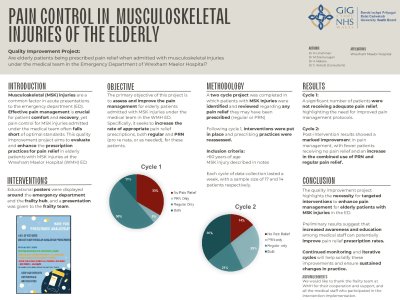 Introduction: Musculoskeletal (MSK) injuries are a common factor in acute presentations to the emergency department (ED). Effective pain management is crucial for patient comfort and recovery, yet pain control for MSK injuries admitted under the medical team often falls short of optimal standards. This quality improvement project aims to evaluate and enhance the prescription practices for pain relief in elderly patients with MSK injuries at the Wrexham Maelor Hospital (WMH) ED. Methods: A two cycle project was completed in which patients with MSK injuries were identified and reviewed regarding