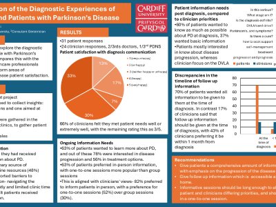 Introduction This project aims to explore the diagnostic experiences of people with Parkinson’s disease (PD) and compares this with the experiences of healthcare professionals diagnosing PD, to inform areas of improvement to increase patient satisfaction. Method A quality improvement project conducted using two surveys, one aimed at clinicians, and one aimed at people with PD, which were distributed via email and in person, to allow insights to be gained from conversation. Results 31 patients and 24 professionals completed the surveys. 63% of patients were happy with the diagnosis