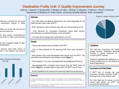 Background Evidence shows that CGA based in Frailty units is better for patient care (Fox 2012, Ellis 2011). University Hospital Wishaw (UHW) is the only acute site in NHS Lanarkshire that does not have a frailty assessment unit as part of the admission/receiving pathway. Patients are currently admitted to the Medical Assessment Unit (MAU) and seen by either Geriatrician or Medical consultant depending on the time of admission. UHW is working towards a frailty unit but has been limited by space and resource. Instead we have been on a journey of step-wise improvements to establish one. Methods