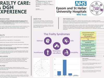 Introduction At Epsom and St Helier, a dedicated Frailty service exists during daytime hours, and not weekends, nights or Bank Holidays. During these hours, patients are reviewed primarily by a cohort of “frailty-naïve” medical junior doctors. We aimed to compare the management plans, patient outcomes, rates of discharge, documentation and care delivered by medical junior doctors to that of an established frailty service. Methodology Data on presenting complaint, demographics, degree of frailty, postcode was collected on all patients over the age of 65, presenting to A&E at Epsom and St Helier