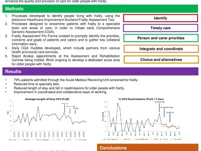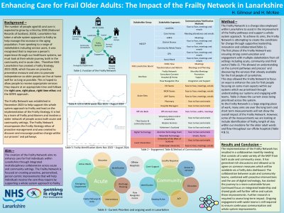 Introduction The Frailty Network, initiated in November 2023, aims to enhance care for frail patients through multidisciplinary collaboration across acute and community settings. By fostering partnerships with Health and Social Care teams, GPs, district nurses, and third sector organisations, the Network strives to provide realistic and patient-centric improvements in Lanarkshire. The initiative focuses on proactive, personalised, and coordinated support to help frail older adults maintain independence and well-being. Methods The Frailty Network is supporting multiple teams to implement new
