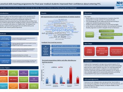 INTRODUCTION: Medical students may find practical aspects of the transition to FY1 doctor challenging. In recent years medical curriculums have been updated to address this issue by increasing the emphasis on assistantships and practical learning. We explored how prepared final year medical students felt for managing common scenarios in geriatrics, such as a patient with delirium or inpatient falls. This allowed us to develop a tailored teaching programme to be delivered by junior doctors with relevant practical experience. METHODS: 1) We surveyed assistantship students in geriatrics to