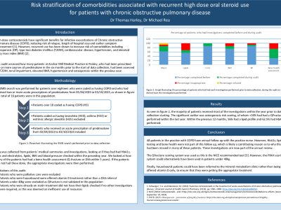 Introduction High-dose corticosteroids have significant benefits for infective exacerbations of COPD, reducing risk of relapse, length of hospital stay and earlier symptom improvement. However, recurrent use has been shown to increase risk of comorbidities including osteoporosis, type two diabetes mellitus (T2DM), cardiovascular disease, hypertension, and elevated body mass index (BMI). This audit assessed how many patients at Anchor Mill Medical Practice in Paisley, who had been prescribed two or more courses of prednisolone in the six months prior to the start of data collection, had been