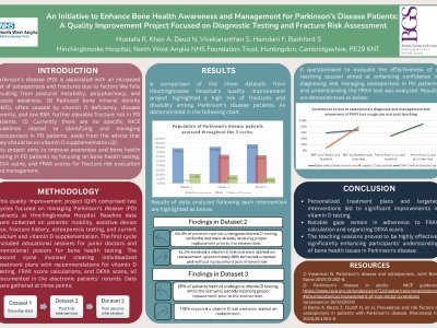 Introduction: Parkinson's disease (PD) is associated with an increased risk of osteoporosis and fractures to factors like falls resulting from postural instability, polypharmacy, and muscle weakness. Reduced bone mineral density (BMD), often caused by vitamin D deficiency, disease severity, and low BMI, further elevates fracture risk in PD patients. This project aims to improve awareness and bone health testing in PD patients by focusing on vitamin D, bone profile assessments, DEXA scans, and FRAX scores for fracture risk evaluation and management. Methodology: This QIP involved two cycles