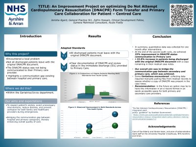 Background: This improvement project was done within the Geriatrics/ Stroke department and aims to meet the following adapted standards: all discharged patients must leave with the original DNACPR document, and clear documentation of their DNACPR and review status in the immediate discharge letter to their Primary care provider. Local problem: Firstly, not all discharged patients leave with the original DNACPR document and secondly, their DNACPR status was not communicated to their Primary care provider which highlights a communication gap which exists between secondary and primary care