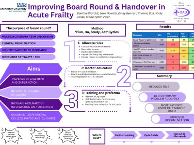 Introduction Board round is essential in geriatric care for clinical prioritisation, planning discharges and identifying any barriers to discharge. This process can be limited by poor handover, lack of roles and a defined structure. This project aimed to improve board round efficiency in an inpatient acute frailty setting. Methods The project involved a 2 stage PDSA cycle including data collection at baseline and after each successive intervention. Stage 1: Role allocation and Board round proforma Stage 2: Doctor education Data related to several outcomes was collected retrospectively over 4-5