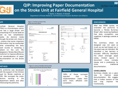 AIM As doctors rotate through the busy stroke unit at Fairfield General Hospital (FGH), there is a chance that some important information may be overlooked while undertaking the daily ward rounds or reviewing a patient on the unit. It is essential that documentation is compliant with the Royal College of Physician’s guidelines for ward round documentations, including the ‘SOAP criteria’ (Subjective, Objective, Assessment and Plan). We designed a ‘Stroke Ward Round Proforma’ to improve efficiency and standardisation of documentation on the stroke ward. METHODS The proforma was developed with