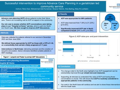 Introduction Advance care planning (ACP) offers patients the opportunity to plan their future care. There is an increasing role for ACP in the community, where there may be more time and chance to build rapport, than in hospital. We aimed to assess ACP engagement within our “Hospital@home” service. Methods Data was collected for patients referred to @home in December 2023. Those appropriate for ACP had a Clinical Frailty Score (CFS) >=6, or a comorbidity with a poor prognosis. Interventions included interactive seminars, and the creation of lanyards and posters. Senior clinicians also prompted