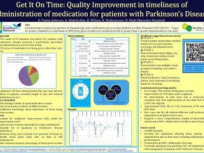 Local Situation: 2023 audit showed 57% of Parkinson’s disease medications were given within acceptable time frame of thirty minutes of prescribed time. The target for this project is a sustained improvement (demonstrated by a run chart showing improvement over two months) with a minimum of 80% of these medications being given in 30 minute time window. Methods: Effective strategies from other centres and Parkinson’s UK resources were adopted to trail as PSDA interventions in our hospital: visual bedside timing reminder aids, educational sessions for nursing and medical teams, posters to raise
