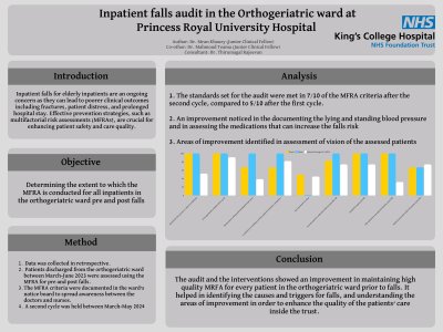 Title: Inpatient falls audit in the Orthogeriatric ward in Princess Royal University Hospital Introduction: Inpatient falls for elderly inpatients are an ongoing concern as they can lead to poorer clinical outcomes including fractures, patients’ distress, and prolonged hospital stay. Effective prevention strategies, such as multifactorial risk assessments (MFRAs), are crucial for enhancing patient safety and care quality. Aim: Determining the extent to which the MFRA is conducted for all inpatients in the orthogeriatric ward pre and post falls Method: Data were collected in retrospective