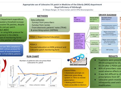 Aim: To achieve compliance in > 90% of patients with the NHS Lothian protocol for 'Management of MSK pain in frail elderly’. Background: NHS Lothian Medicine of the Elderly Department expenditure review showed a 3-fold rise in Lidocaine 5% patch costs the last year. Lack of adherence to the protocol and monitoring of patches prescriptions’ effectiveness felt to contribute. Methods: A doctors’ team with pharmacy support reviewed expenditure report from April 2023 to April 2024. A prescribers’ survey was sent to evaluate current practises, and another one to nursing staff who administer patches