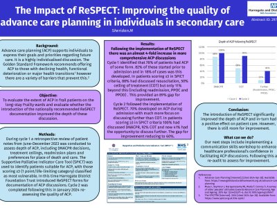 Introduction: Advance care planning (ACP) supports individuals to express their values and goals regarding future care, playing a crucial role in patient-centred approach. The Gold Standard Framework (GSF) recommends offering ACP to those with declining health, functional deterioration, or major health transitions. Prior to this project, Harrogate District Foundation Trust (HDFT) had not evaluated ACP quality for >2 years, relying solely on DNACPR forms and patient notes. This QIP assessed the impact of implementing the nationally recommended ReSPECT documentation on ACP quality. Objective: To