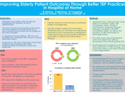 INTRODUCTION A treatment escalation plan (TEP) should be established for patients at risk of clinical deterioration, particularly when the risks or benefits of specific therapies are uncertain. This plan should be formulated considering inputs from both the patient and their family (SIGN 167). In hospital-at-home setting, TEP was not routinely completed during admission, leading to unclear anticipatory care plans. However, after emphasizing the importance of TEP, we observed significant improvements that positively impacted patient care. METHODS Over the course of a month, we collected data