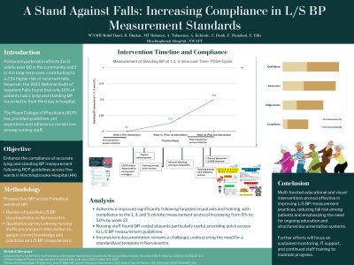 TITLE: Improving the Practice of Measuring Lying and Standing Blood Pressure Among Nursing Staff at a District General Hospital INTRODUCTION: Postural hypotension is a significant cause of morbidity in the frail and older population, contributing to falls and related injuries. Accurate measurement of lying and standing blood pressure (LSBP) is essential for identifying patients at risk. This quality improvement project (QIP) aimed to address gaps in LSBP measurement practices among nursing staff by aligning them with Royal College of Physicians (RCP) guidelines. The project sought to raise