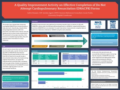 Background: This improvement activity was done within the Geriatrics/ Stroke department and aims to meet the following adopted standards: all DNACPR forms must be signed by a senior clinician and have clear documentation of the review status, if not “indefinite.’ Local problem: Incomplete DNACPR forms with lack of senior clinicians’ signature and unclear review status, which would affect clinical effectiveness of the document. Methods: To gather baseline and post-intervention measurements, snapshot data was collected eighteen days apart to identify patients with a DNACPR in place that includes