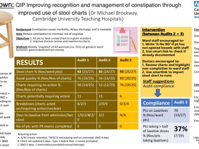 Background Constipation causes morbidity, delays discharge, and is treatable. Aims Reduce constipation to minimise risk of sequelae. Objectives 1. All patients to have a stool chart to a given standard 2. Improve doctors review and reaction to charts Methods Weekly ‘snapshot’ of all ward patients on a geriatric ward in a large teaching hospital. Exclusion: gastrointestinal tract stomas. All patients' computer notes were assessed to determine: presence of stool charts, level of quality, and whether action was required or had taken place. Days to laxative (from admission or last bowel opening)
