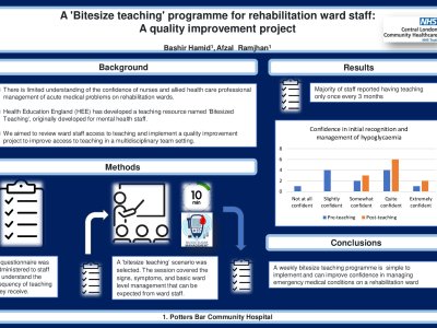 Background: There is limited understanding of the confidence of nurses and allied health care professional management of acute medical problems on rehabilitation wards. Health Education England (HEE) has developed a teaching resource named ‘Bitesized Teaching’, originally developed for mental health staff. We aimed to review ward staff access to teaching and implement a quality improvement project to improve access to teaching in a multidisciplinary team setting. Methods: An questionnaire was administered to staff to understand the frequency of teaching they receive. A ‘bitesize teaching’