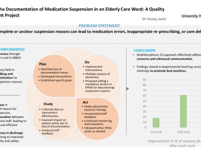 Background: Accurate documentation of medication suspension is crucial for patient safety, especially during transitions such as out-of-hours discharges. In early 2023, an audit in our hospital’s elderly care ward revealed a significant number of medications were suspended without proper documentation, raising concerns about continuity of care, medication errors, and patient outcomes. This Quality Improvement Project (QIP) aimed to improve the consistency, clarity, and quality of documentation in the ward to enhance patient safety and reduce risks associated with incomplete information