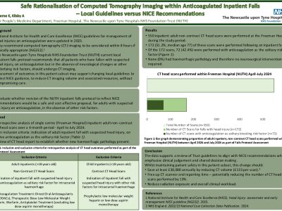 The National Institute for Health and Care Excellence (NICE) guidelines for management of head injuries on anticoagulation were updated in 2023, to maximise detection of clinically important falls whilst minimising unnecessary scans. They recommend computed tomography (CT) imaging to be considered within 8 hours if clinically appropriate [NG232]. [1] The Newcastle upon Tyne Hospitals NHS Foundation Trust (NUTH) current local inpatient falls protocol recommends that all patients who have fallen with suspected head injury, on anticoagulation but in the absence of neurological changes or other