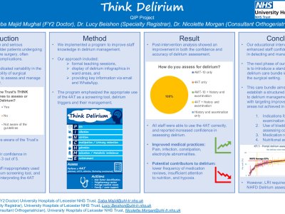 Introduction: Delirium is a common and serious complication in frail older patients undergoing emergency hip fracture surgery, often resulting in prolonged hospital stays, increased morbidity, and a greater risk of long-term cognitive decline. Recognizing and managing delirium effectively is critical in improving patient outcomes. However, initial assessments indicated variability in the confidence and capability of surgical postgraduate doctors to assess and manage delirium appropriately. A baseline survey revealed that 50% of staff were not familiar with hospital delirium guidelines, and 62%
