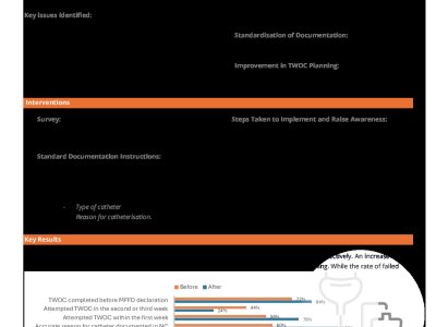 Background: Urine retention is a common reason for catheterization in elderly patients in hospitals. Early focus on regular bowel movements, and bladder or prostate issues can facilitate timely TWOC planning. Inaccurate or incomplete documentation leads to unnecessarily prolonged catheter use, and extended hospital stays. Identified problems were –1: Fragmented documentation across different Portals.2: Dual Documentation Systems- paper and digital 3: Lack of documentation at Admission.4: Delayed TWOC planning. Aims: 1. Standardization of Documentation: Transition to using the NerveCentre