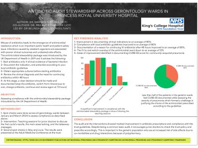 Title: Antibiotic Stewardship Audit in Gerontology wards in Princess Royal University Hospital Introduction: Misuse of antibiotics leads to the emergence of antimicrobial resistance, which is an important public health and patient safety issue. Infections caused by resistant organisms are associated with poorer clinical outcomes and undesired side effects. Aim: Assessing compliance with the antimicrobial stewardship package introduced by the UK Department of Health in 2011 and with the trust guidelines. Method: * Spot checks done across all gerontology wards between January and March 2024 to