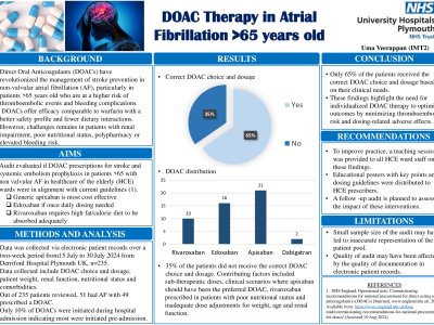 Direct Oral Anticoagulants (DOACs) have revolutionized the management of stroke prevention in non-valvular atrial fibrillation (AF), particularly in patients >65 years old who are at higher risk of thromboembolic events and bleeding complications. DOACs offer efficacy comparable to warfarin with a better safety profile and fewer dietary interactions making them suitable for elderly patients. However, challenges remain in patients with renal impairment, polypharmacy, poor nutrition or elevated bleeding risk. An audit at Derriford Hospital, Plymouth, evaluated DOAC prescriptions for stroke and